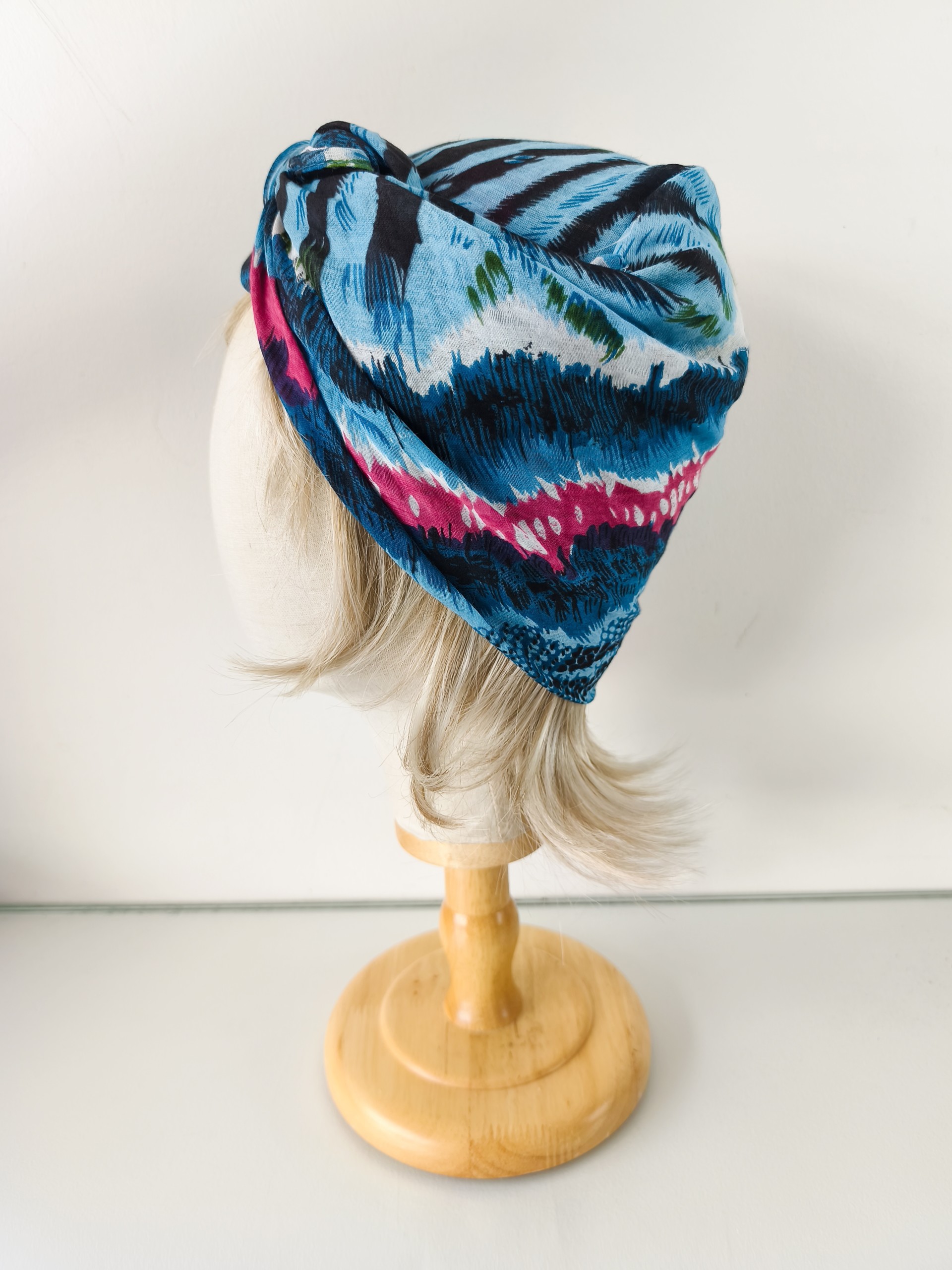 sur la tete en fleur (devant) ou sur la tete en corsaire (derrière) ou en crop top en mettant le bandeau autour du cou et en nouant le foulard dans le dos